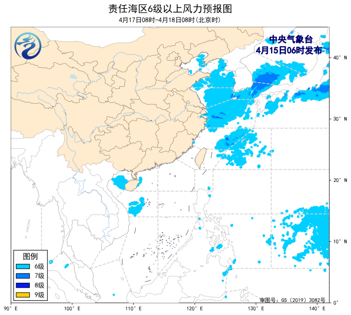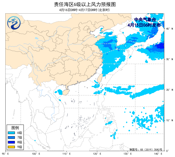 4月14日14时至15日02时,黄海中部和南部海域、东海北部海域出现了6~8级、阵风9级的偏西风或西北风,东海南部海域出现了5~6级、阵风7级的偏北风,南海西南部海域出现了5~6级、阵风7级的旋转风。