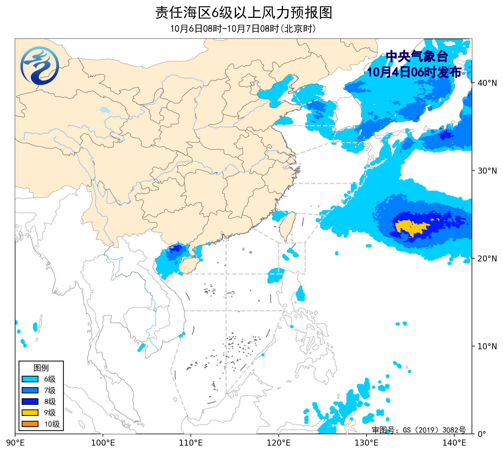 4日08时至5日08时,南海西北部海域将有10~11级、阵风12级的偏北风增大到12~13级、阵风14级的偏南风,南海东北部海域将有11~12级、阵风13级的偏南风,南海中东部海域将有10~11级、阵风12级的西南风减弱到8~9级、阵风10级的偏南风,琼州海峡将有4级以下的偏西风增大到8~9级、阵风10级的西北风,南海中西部海域将有7~9级、阵风10级的偏西到西南风,北部湾将有4级以下的偏东风增大到6~7级、阵风8级的西北风,渤海将有4级以下的西南风增大到5~6级、阵风7级的东北风,南海西南部海域将有4~6级、阵风7级的西南风,东海南部海域、台湾海峡、巴士海峡将有4~6级、阵风7级的偏南到东南风。