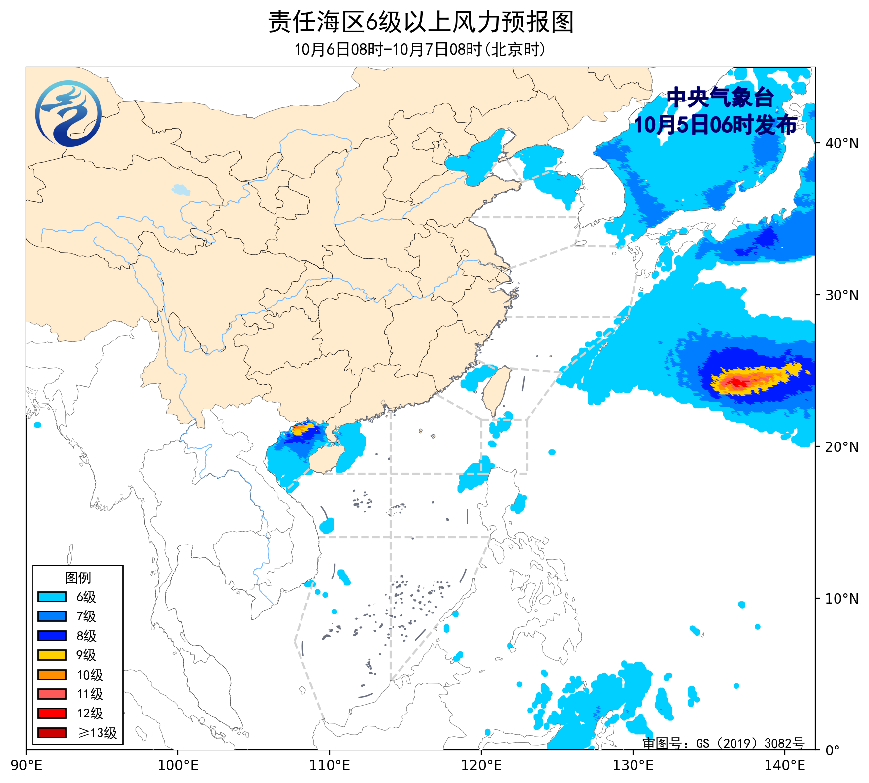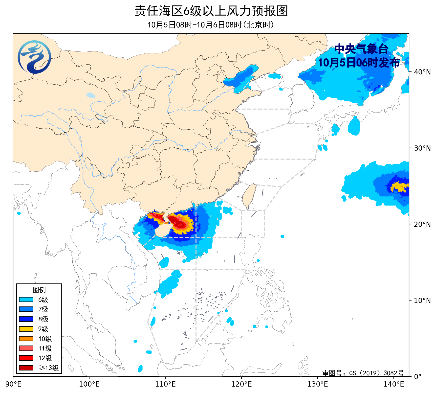 5日08时至6日08时,南海西北部海域将有13~14级、阵风15级减弱到8~9级、阵风10级的东南风,琼州海峡将有12~13级、阵风14级的偏西风减弱到8~9级、阵风10级的偏南风,北部湾将有11~12级、阵风13级的西北风转西南风,渤海将有6~7级、阵风8级的东北风,南海东北部海域将有6~7级、阵风8级减弱到4~5级的东南风,南海中西部海域将有5~7级、阵风8级的西南风到偏南风,南海中东部海域将有5~6级、阵风7级减弱到4级以下的偏南风。