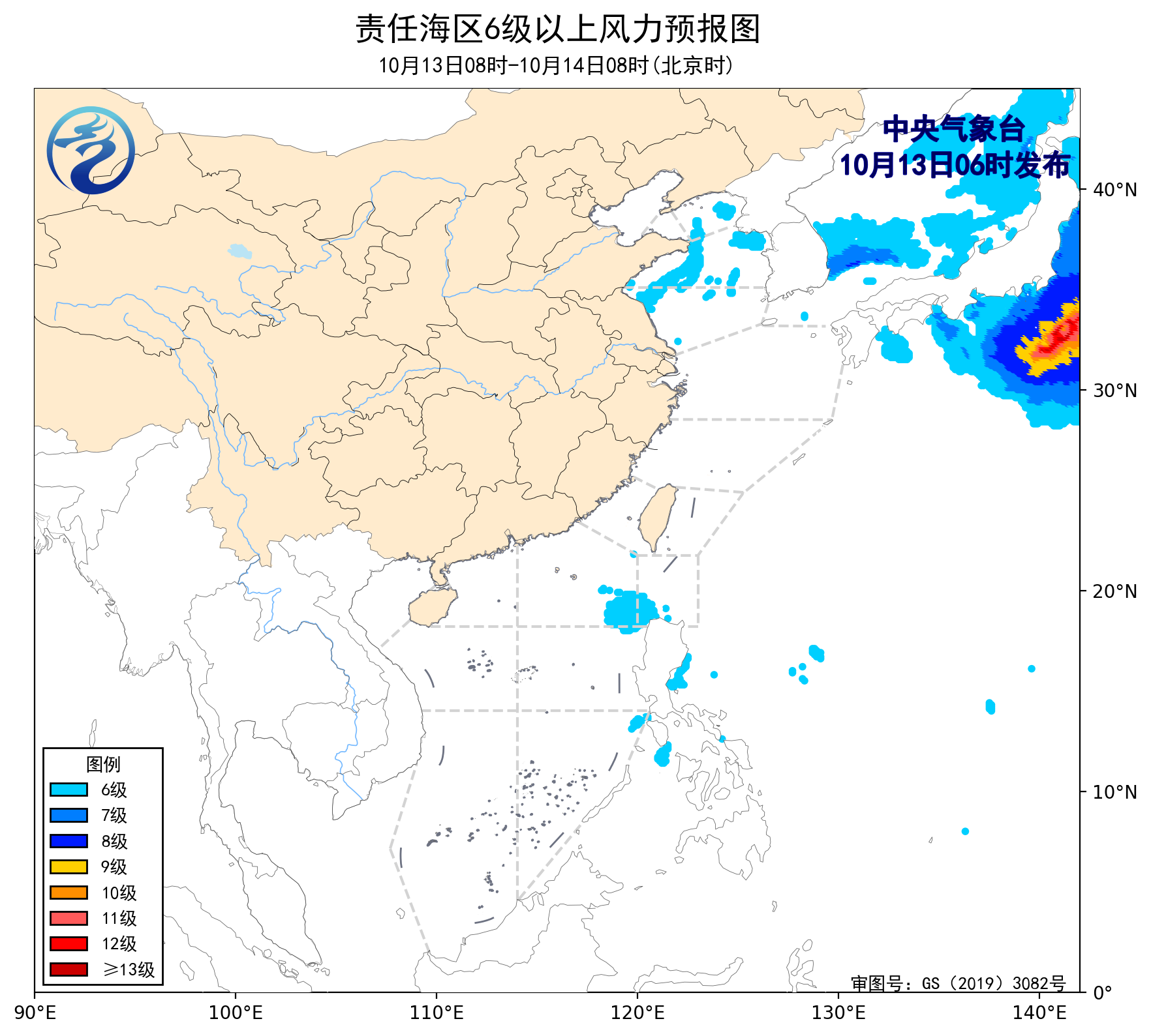 10月12日14时至13日02时,我国近海以5级及以下风力为主