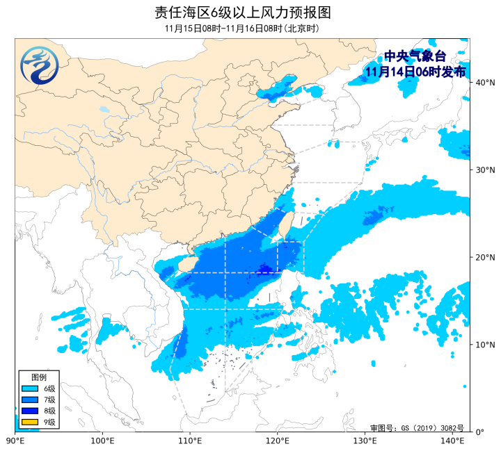 14日08时至15日08时,台湾海峡将有6~8级、阵风9级的东北风,东海南部海域、台湾以东洋面、巴士海峡、南海北部和西南部海域将有5~7级、阵风8级的东北风,东海北部海域、北部湾、琼州海峡、南海中部和东南部海域将有4~6级、阵风7级的偏北到东北风。