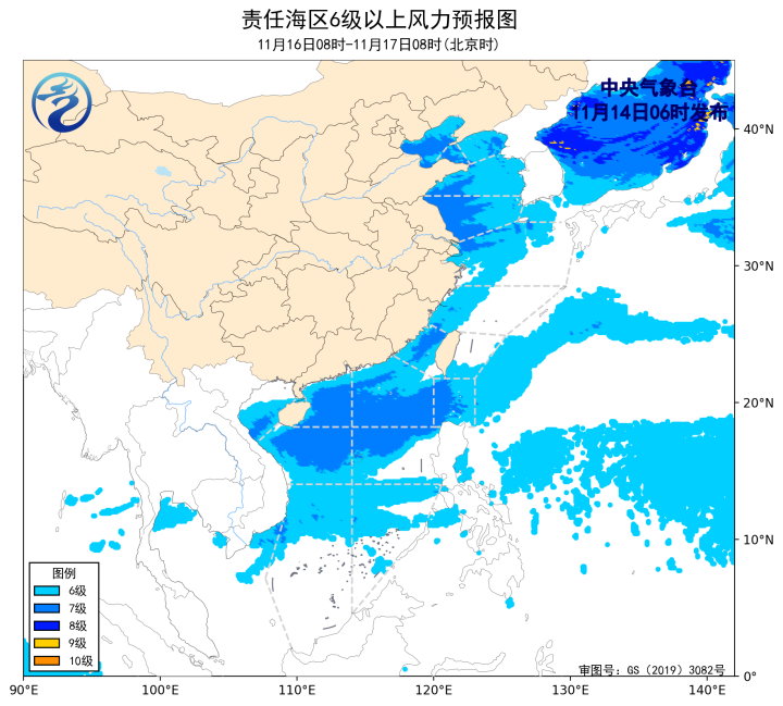 16日08时至17日08时,渤海、渤海海峡、黄海中部和南部海域将有6~7级、阵风8级的偏北到西北风,台湾海峡、巴士海峡、北部湾、南海北部和中部海域将有5~7级、阵风8级的东北风,黄海北部海域将有5~6级、阵风7级的西北风,东海北部海域将有4级以下的东北风增大到5~6级、阵风7级的偏北风,东海南部海域、台湾以东洋面、琼州海峡、南海南部海域将有4~6级、阵风7级的偏东到东北风。