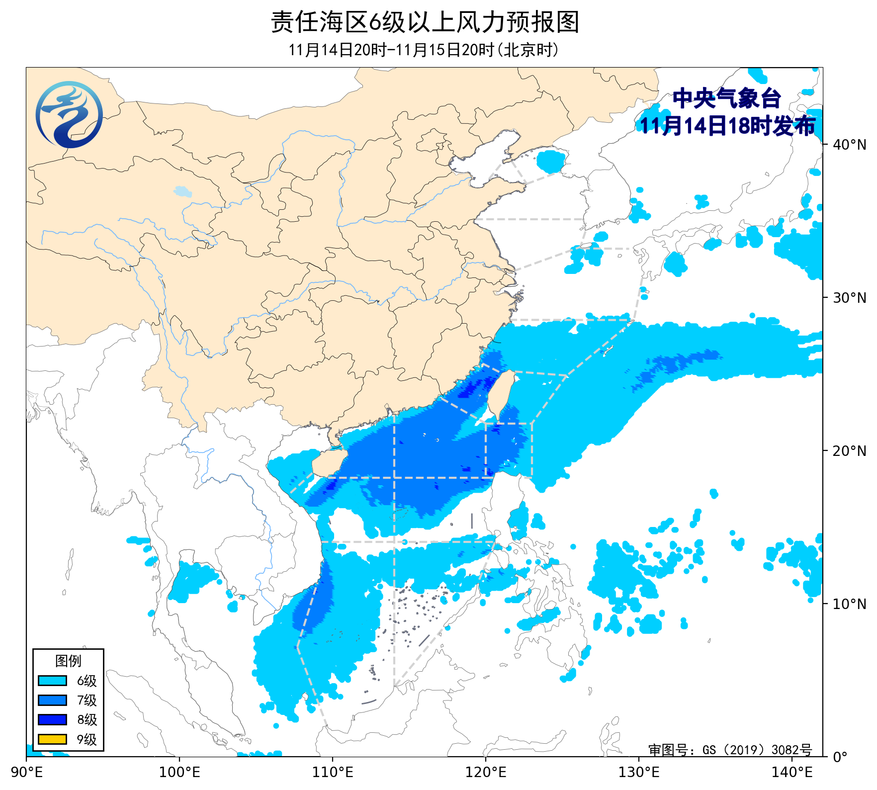 11月14日02时至14时,东海北部海域、南海西部海域出现了5~6级、阵风7级的偏北风,东海南部海域、台湾海峡、台湾以东洋面、巴士海峡、南海东北部海域出现了6~8级、阵风9级的偏北风或东北风。