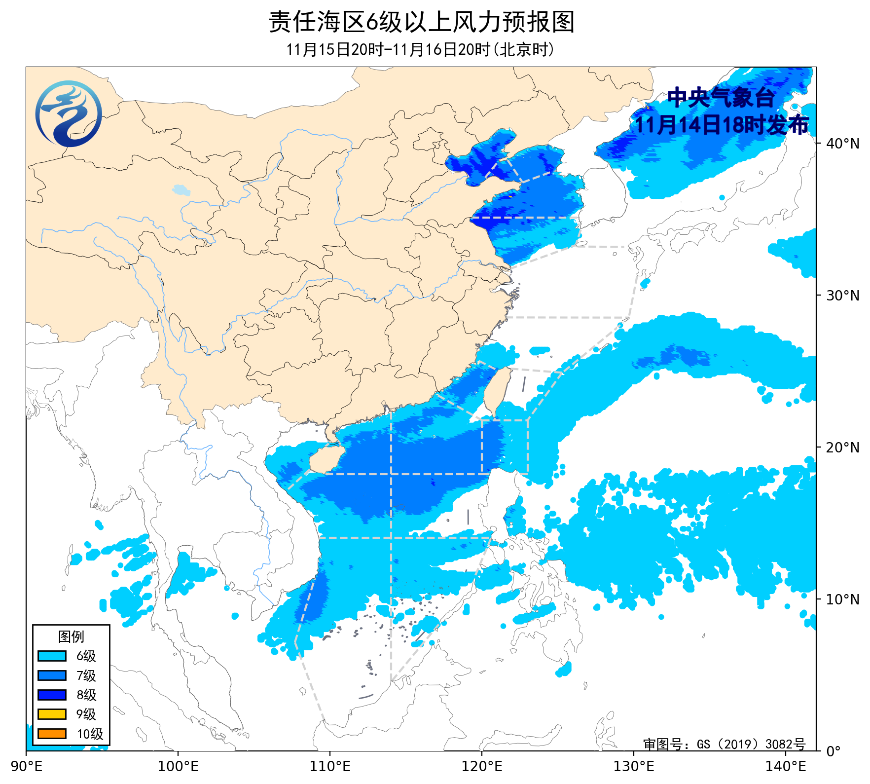 16日20时至17日20时,东海南部海域将有5~6级、阵风7级的东北风增大到7~8级、阵风9级的偏北风,台湾海峡将有6~8级、阵风9级的东北风,渤海、渤海海峡、黄海南部海域、东海北部海域将有5~7级、阵风8级的偏北到西北风,南海北部海域将有5~7级、阵风8级的东北风,黄海北部和中部海域将有5~6级、阵风7级的偏北到西北风,台湾以东洋面、巴士海峡、北部湾、琼州海峡、南海中部和东南部海域将有4~6级、阵风7级的偏东到东北风。