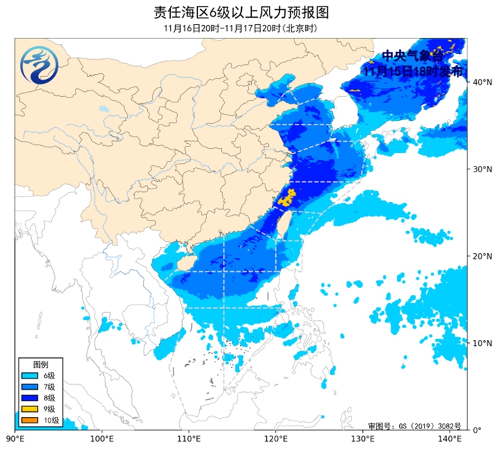 16日20时至17日20时,渤海、渤海海峡、黄海、东海大部海域、台湾海峡、巴士海峡、北部湾偏南海域、南海北部和中部海域将有7~8级、阵风9~10级的大风,其中东海西南部海域、台湾海峡部分海域风力可达9级、阵风10~11级。