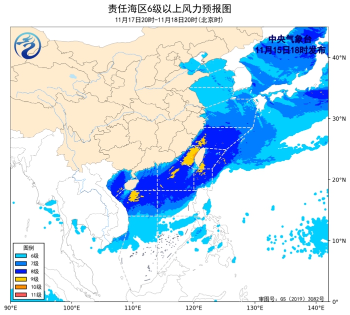 17日20时至18日20时,东海大部海域、台湾海峡、巴士海峡、北部湾偏南海域、南海北部和中部海域将有7~9级、阵风10级的大风,其中台湾海峡部分海域风力可达10级、阵风11级。