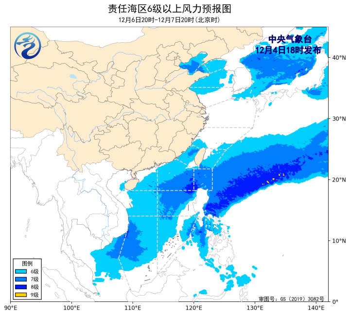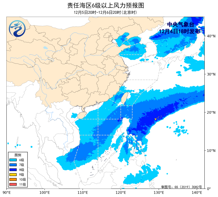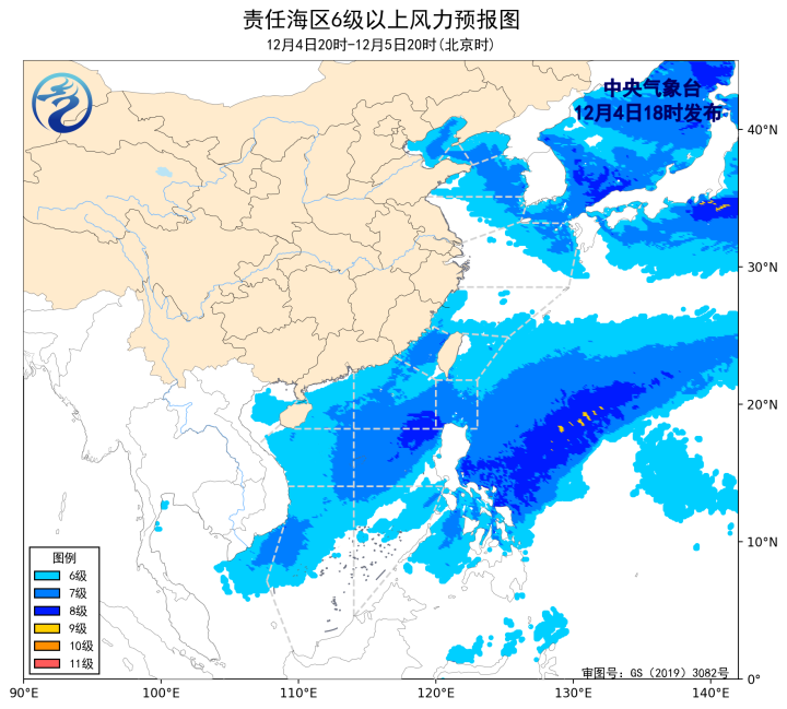 12月4日02时至14时,渤海、渤海海峡出现了6~7级、阵风8~9级的偏北风,黄海北部和中部海域出现了5~7级、阵风8~9级的偏西风,东海南部海域、南海西部海域、南海东南部海域出现了5~6级、阵风7级的东北风或偏东风,台湾海峡、台湾以东洋面、巴士海峡、南海东北部海域出现了6~8级、阵风9级的东北风。