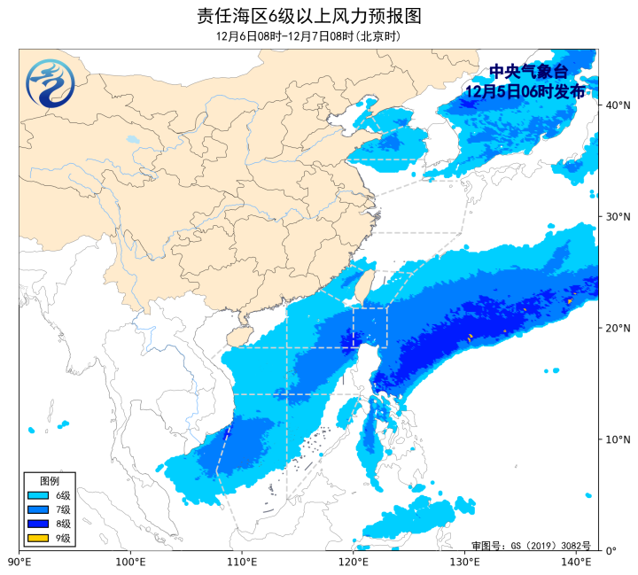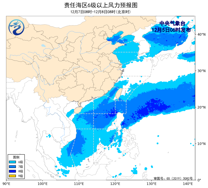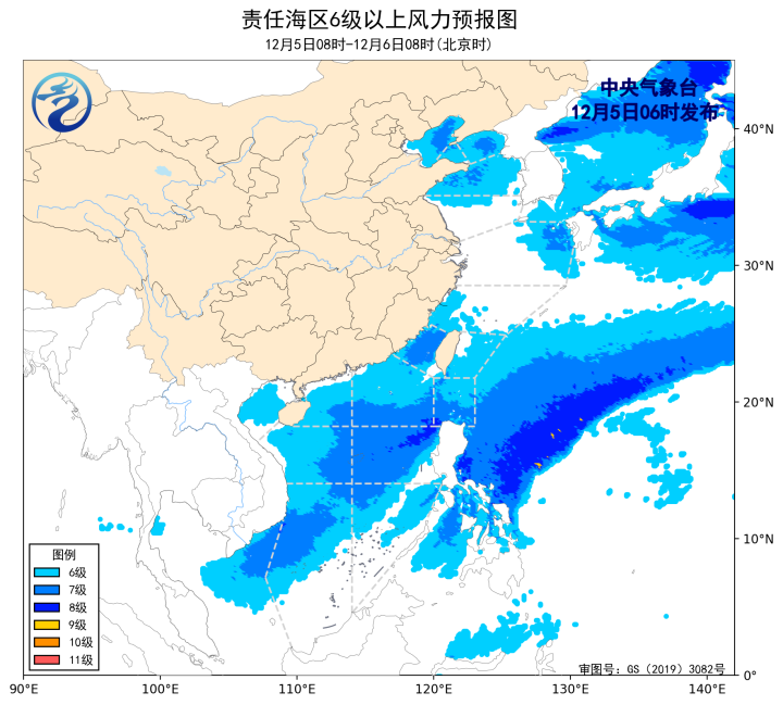 12月4日14时至5日02时,黄海北部和中部海域、东海北部海域出现了5~7级、阵风8级的西北风,黄海南部海域、台湾海峡、台湾以东洋面、巴士海峡、南海北部海域、南海中西部和南部海域出现了5~7级、阵风8级的东北风或偏北风。