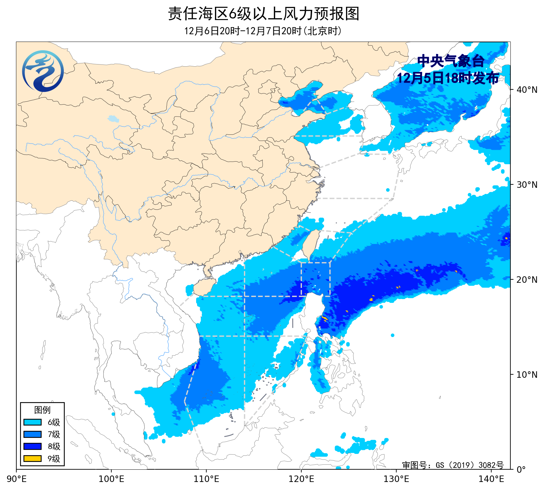 12月5日02时至14时,渤海出现了6~7级、阵风8级的西南风,黄海南部海域、东海大部海域、台湾海峡、巴士海峡、南海北部海域、南海中西部和南部海域出现了5~7级、阵风8级的东北风或偏北风。