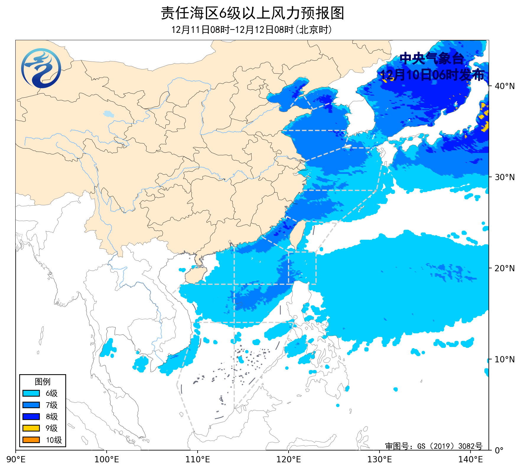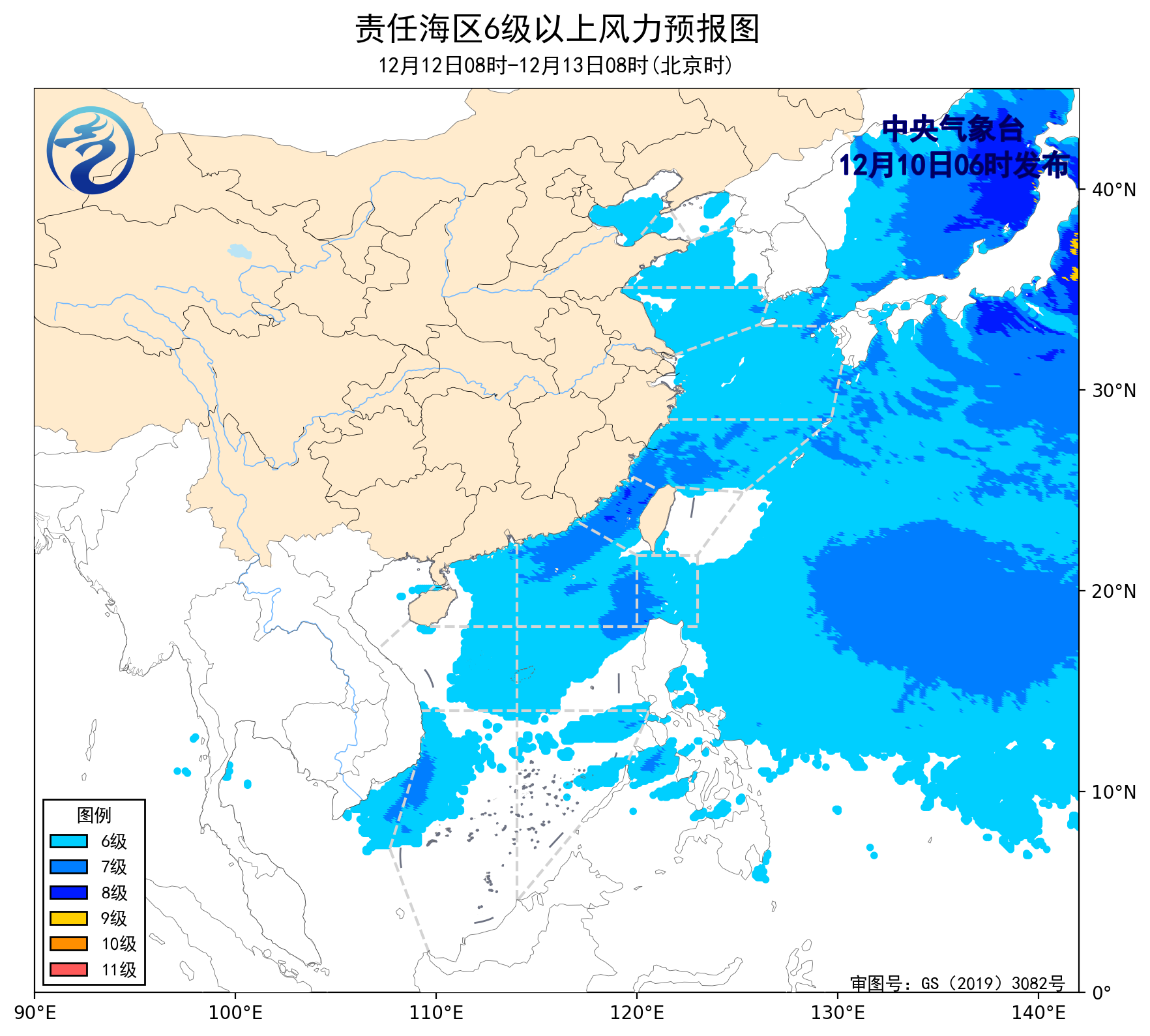 12月9日14时至10日02时,东海南部海域、南海西南部海域出现了5~7级、阵风8级的偏北风,台湾海峡、台湾以东洋面、巴士海峡、南海北部海域、南海中西部海域出现了5~7级、阵风8级的东北风或偏东风。
