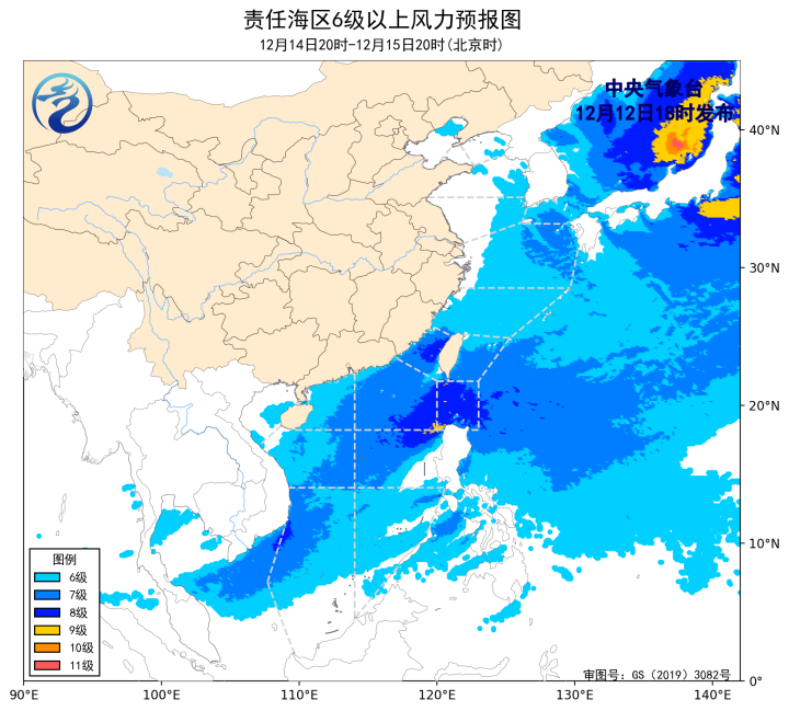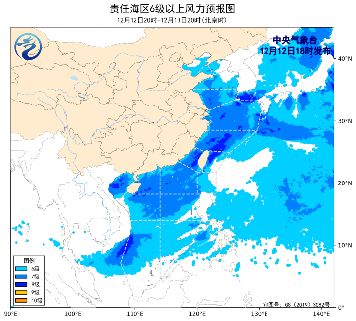 12月12日02时至14时,黄海大部海域、东海大部海域、台湾海峡、台湾以东洋面、巴士海峡、南海北部海域、南海中西部海域出现了5~7级、阵风8级的东北风或偏北风。