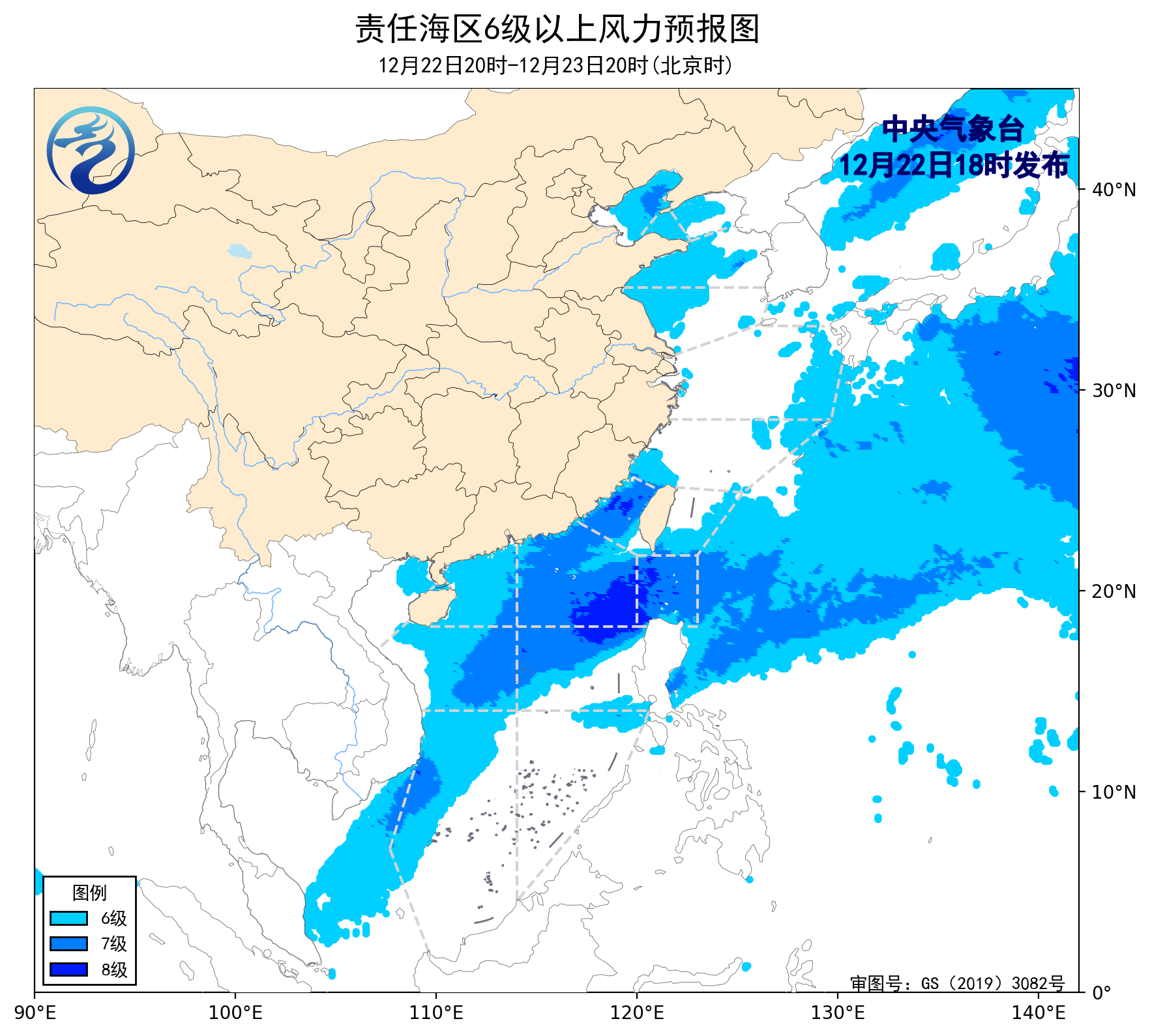 12月22日02时至14时,渤海出现了5~6级、阵风7级的偏南风,东海大部海域、台湾以东洋面、巴士海峡、南海北部海域、南海中西部海域、南海西南部海域出现了5~7级、阵风8级的东北风或偏东风,台湾海峡出现了7~8级、阵风9级的偏北风。