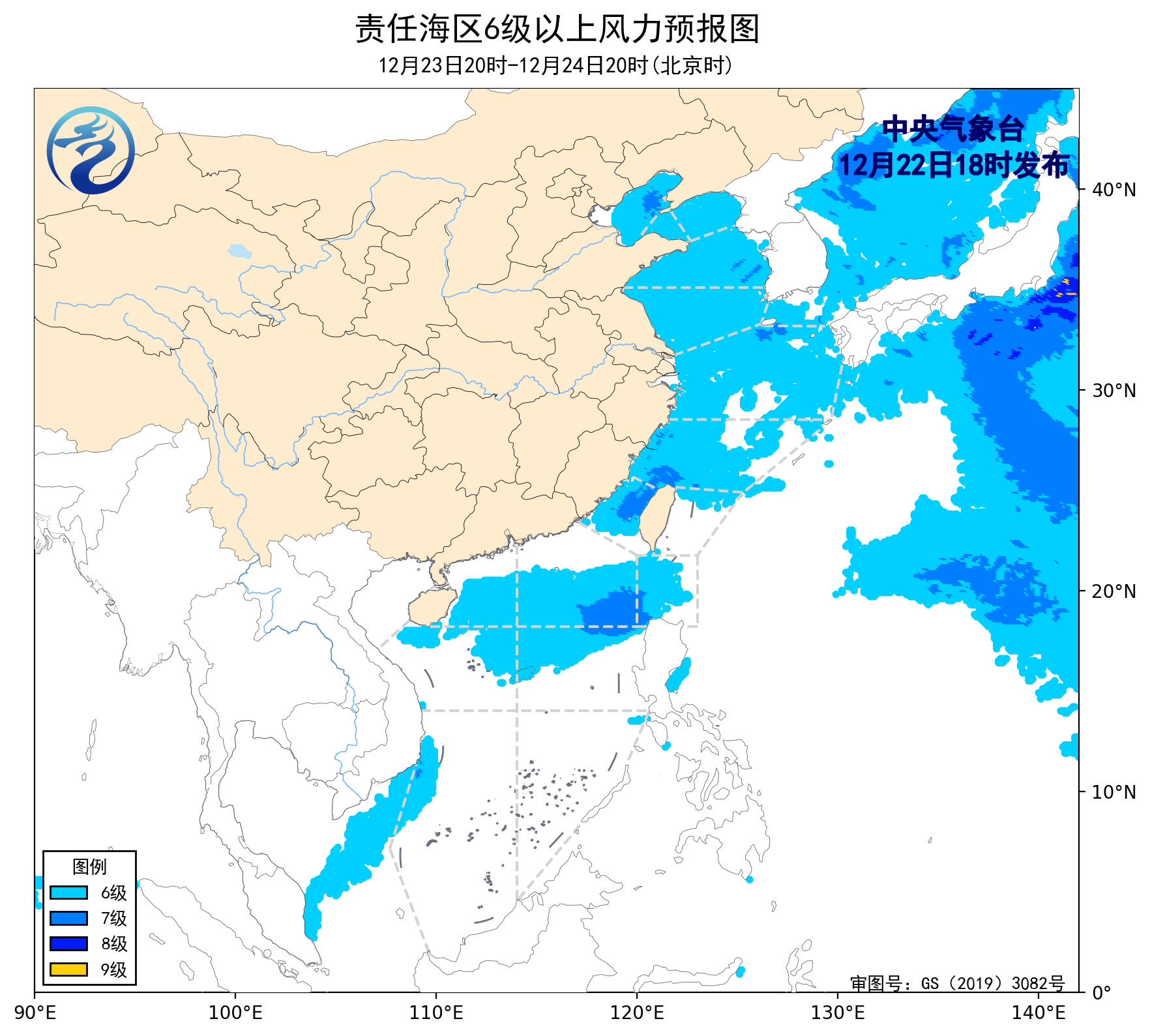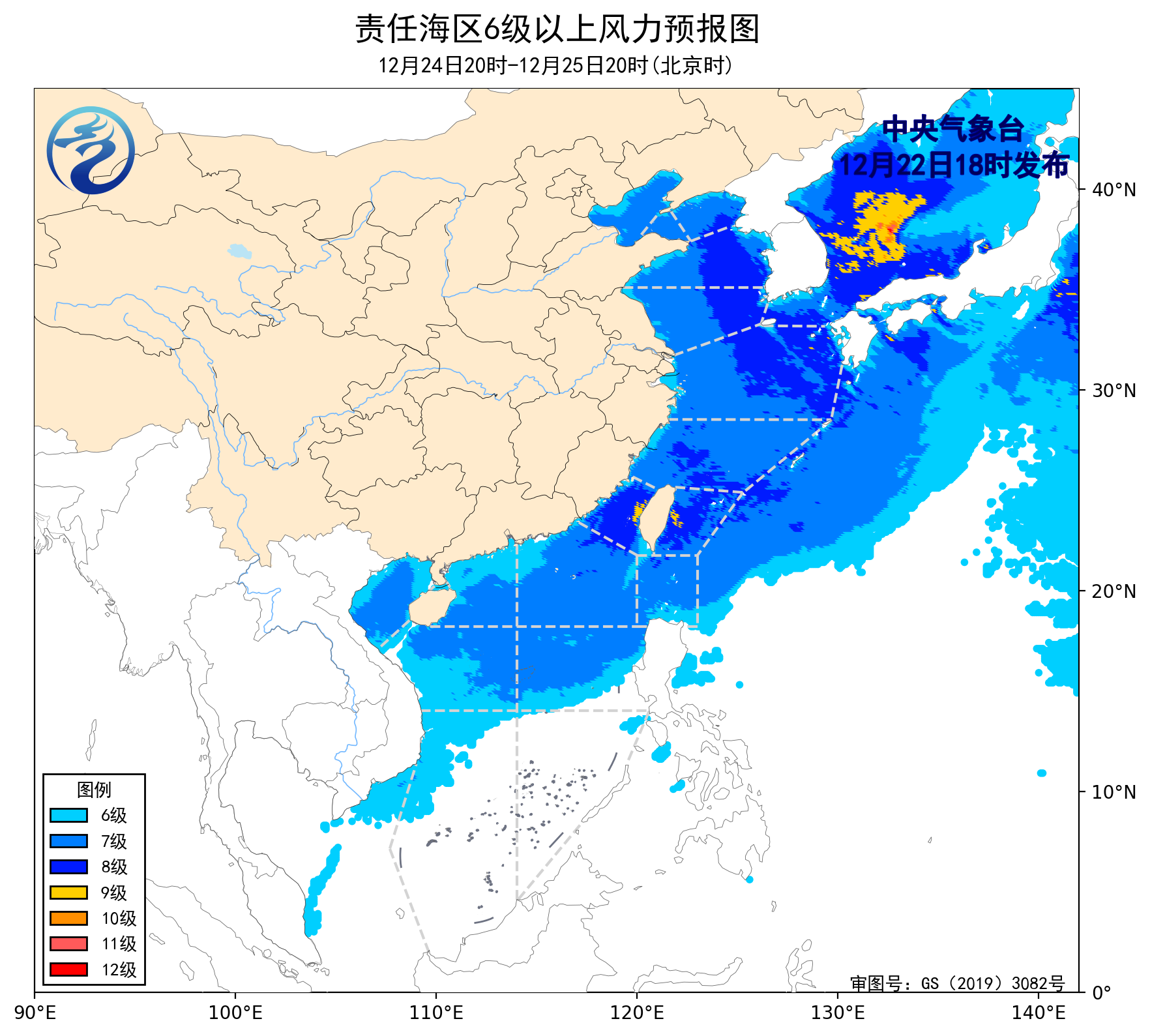 预计,12月25日夜间至12月28日夜间,渤海、北部湾将有6~7级、阵风8级的风,渤海海峡、黄海大部海域、南海大部海域将有6~8级、阵风9级的大风,东海大部海域将有8~9级、阵风10级减弱至6~7级、阵风8级的风,台湾海峡、台湾以东洋面将有7~9级、阵风10级的大风,巴士海峡将有7~8级、阵风9级的大风,琼州海峡将有5~6级、阵风7级的风。