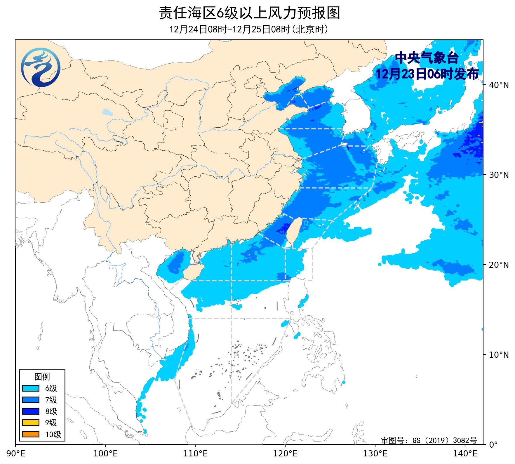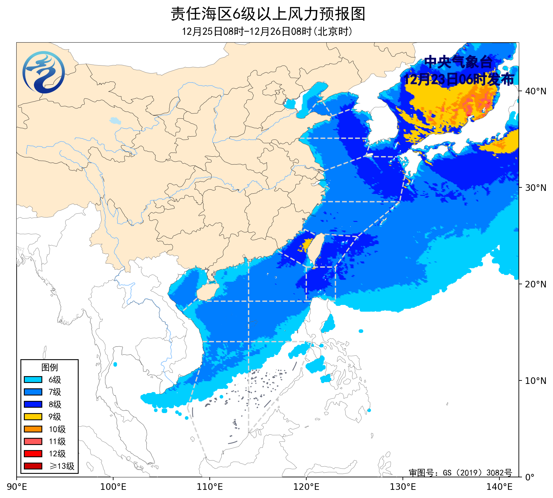 12月22日14时至23日02时,东海南部海域、台湾以东洋面、巴士海峡、南海北部海域、南海中西部海域、南海西南部海域出现了5~7级、阵风8级的东北风或偏东风,台湾海峡出现了6~7级、阵风8级的偏北风。