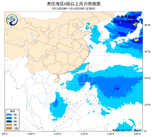 预计,1月14日夜间至1月17日夜间,渤海、渤海海峡、黄海大部海域、东海大部海域、台湾海峡、台湾以东洋面将有6~7级、阵风8级的风,巴士海峡将有7~8级、阵风9级的大风,南海大部海域将有6~8级、阵风9级的大风。