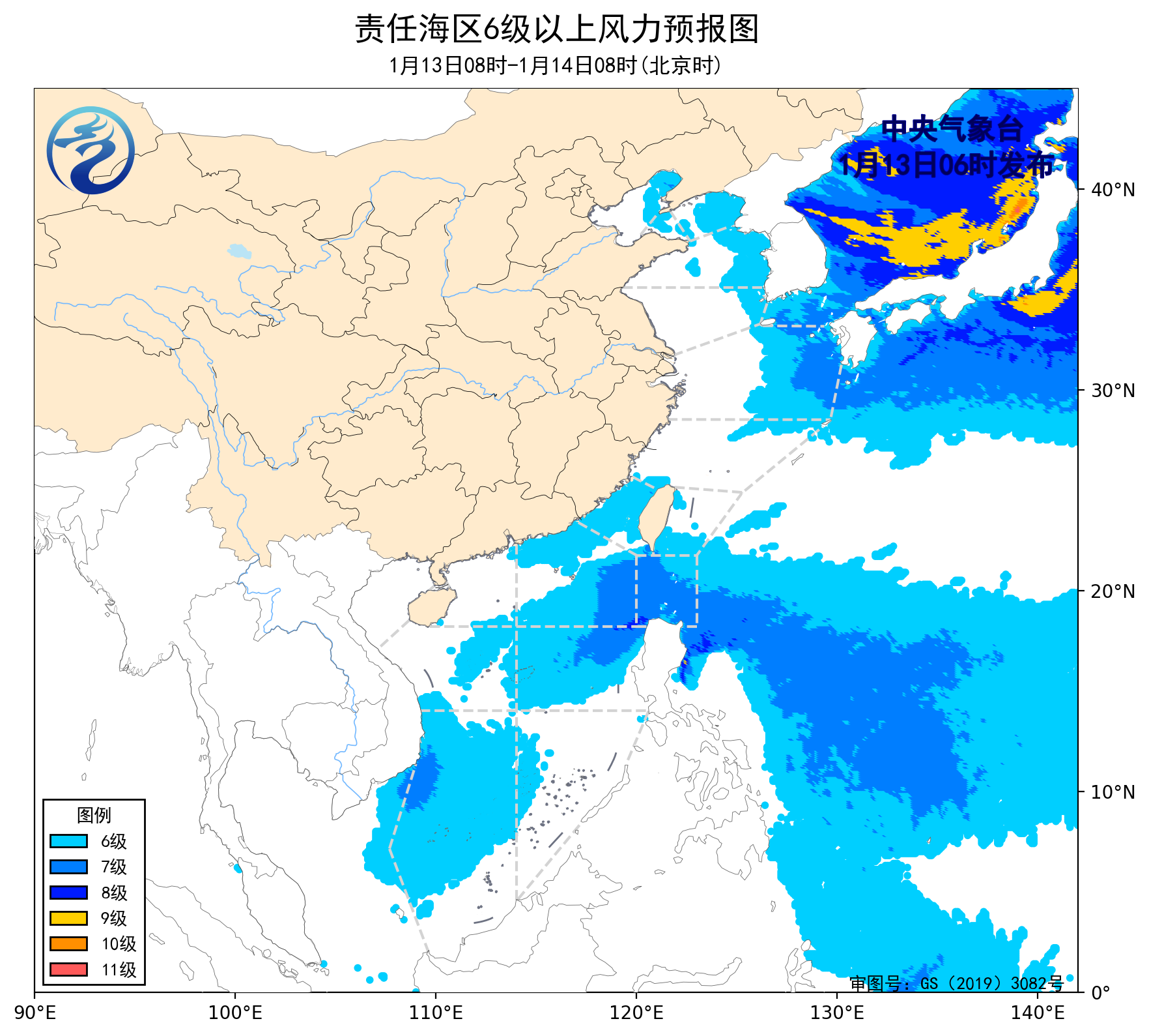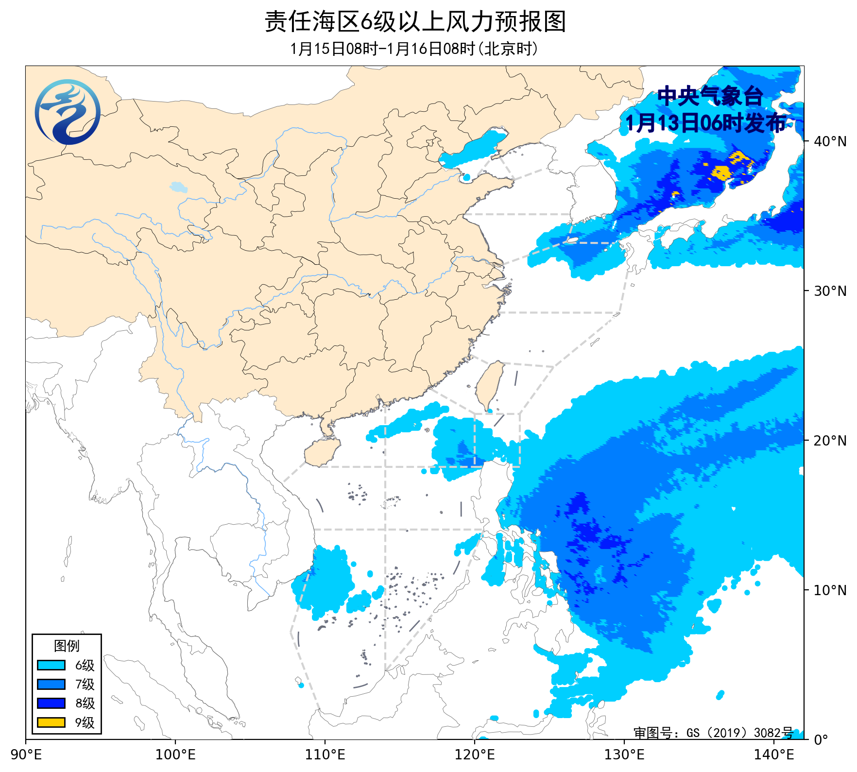 1月12日14时至13日02时,渤海、渤海海峡、黄海大部海域、东海北部海域出现了6~7级、阵风8级的偏西风,巴士海峡、南海大部海域出现了5~7级、阵风8级的东北风。