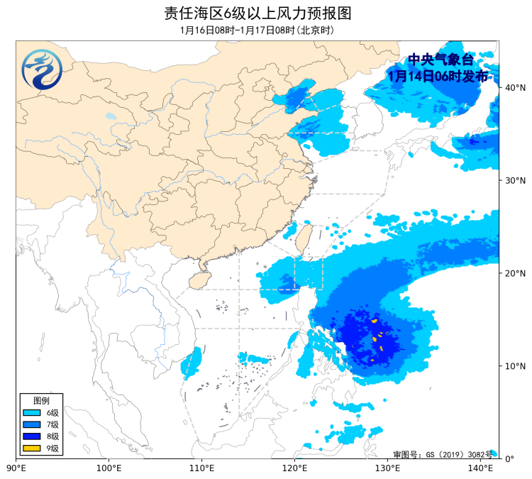 1月13日14时至14日02时,东海北部海域、巴士海峡、南海东北部海域、南海西南部海域出现了5~6级、阵风7级的偏北风或东北风。